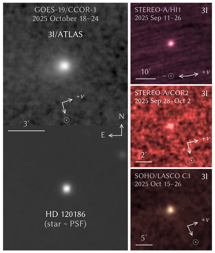 El nuevo artículo (accesible aquí ) informa sobre observaciones de 3I/ATLAS desde los instrumentos SECCHI HI1 y COR2 de STEREO-A, LASCO C3 de SOHO y CCOR-1 de GOES-19 durante los meses de septiembre y octubre de 2025.
